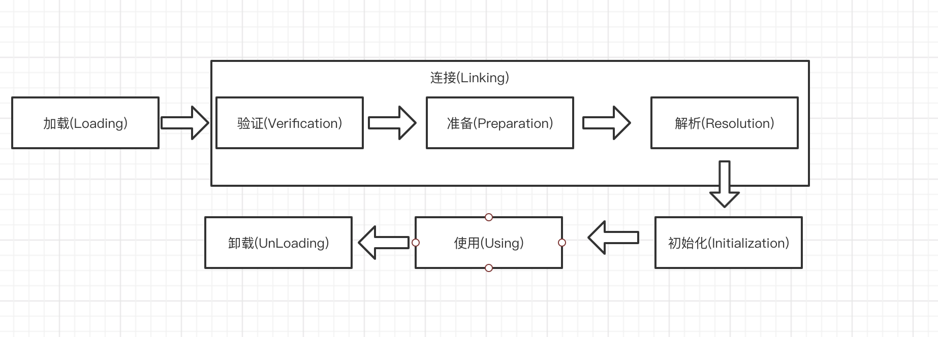 类从被加载到虚拟机内存中开始,到卸载出内存为止,它的整个生命周期包括加载(Loading)、验证(Verification)、准备(Preparation)、解析(Resolution)、初始化(Initialization)、使用(Using)、卸载(UnLoading) 七个阶段,其中类加载过程包括 加载(Loading)、验证(Verification)、准备(Preparation)、解析(Resolution)、初始化(Initialization) 这五个阶段,如下图