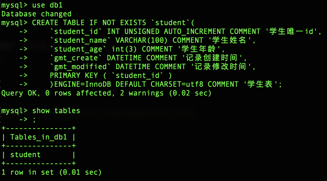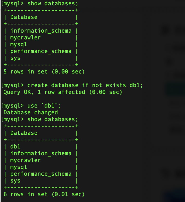 1 | create database if not exists db1 --if not exists是可选的,它是为了在创建数据库前检查需要创建的数据库是否存在,如果存在就不会再执行创建 |