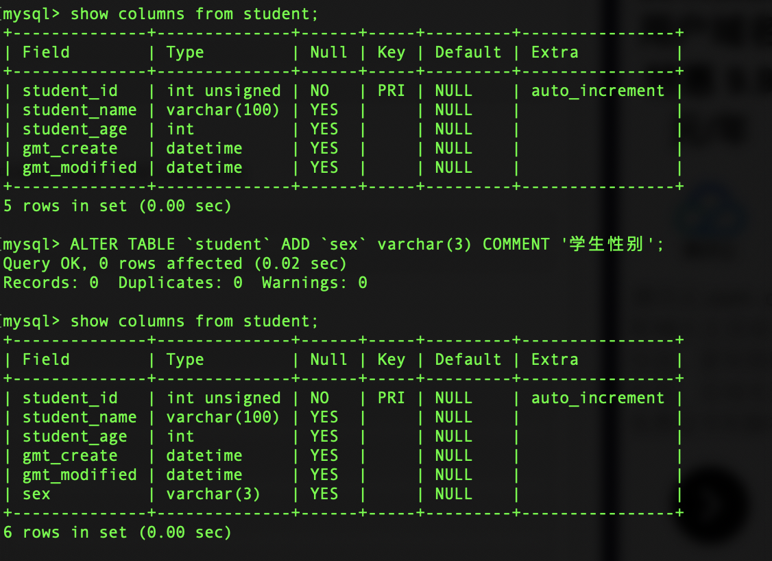 ALTER TABLE `student` ADD `sex` varchar(3) COMMENT '学生性别';